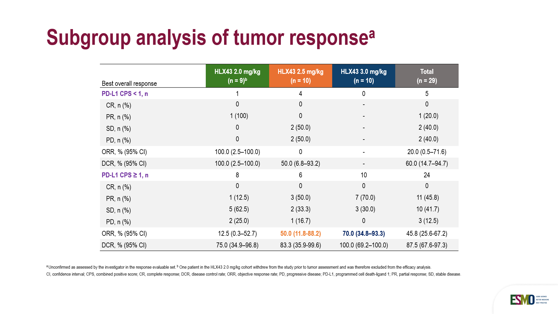 截至2025年9月1日,本研究共纳入30例患者,随机分配接受剂量为2 mg/kg(n=10)、2.5 mg/kg(n=10)和3 mg/kg(n=10)的HLX43治疗。其中超过80%的患者PD-L1综合阳性评分(CPS)≥1。 患者既往接受肿瘤治疗的中位线数为2.0(范围1–4线)。全部患者接受过铂类药物化疗,60%的患者接受过靶向治疗,约50%患者接受过免疫治疗,中位随访时间为3.5个月。