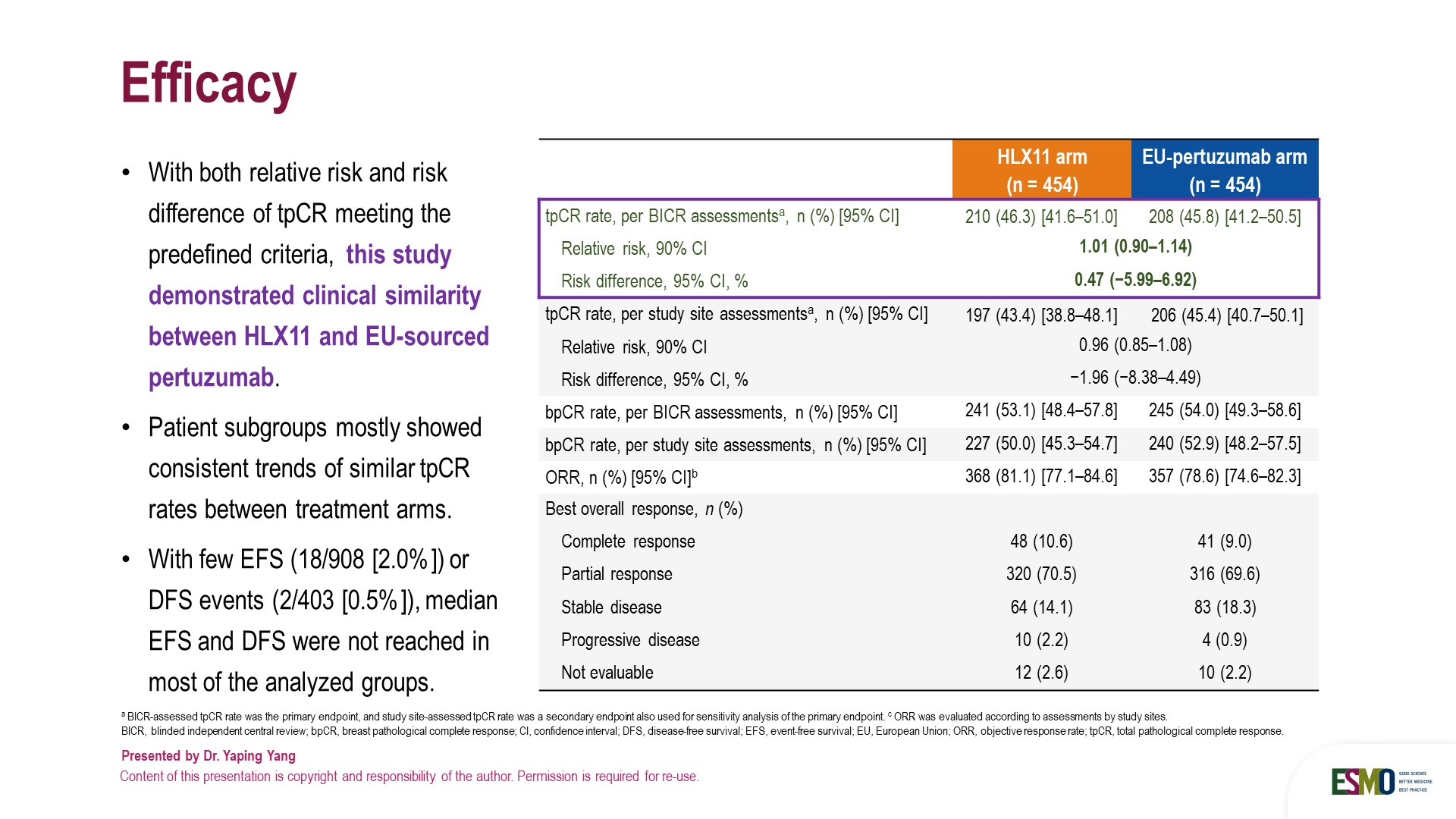 在2022年4月25日至2024年1月30日期间,共有908例HER2阳性、HR阴性早期或局部晚期乳腺癌受试者入组,研究结果显示:HLX11在tpCR方面达到与欧盟来源参考帕妥珠单抗的等效性标准,相对风险比值(RR)为1.01(90% CI: 0.90–1.14),相对风险差值(RD)为0.47%(95% CI: -5.99%–6.92%)。两组在bpCR、ORR、EFS等次要终点方面亦表现出相似趋势。HLX11的安全性、药代动力学(PK)及免疫原性与原研帕妥珠单抗高度一致,且从原研帕妥珠单抗单次转换至HLX11未观察到额外风险。