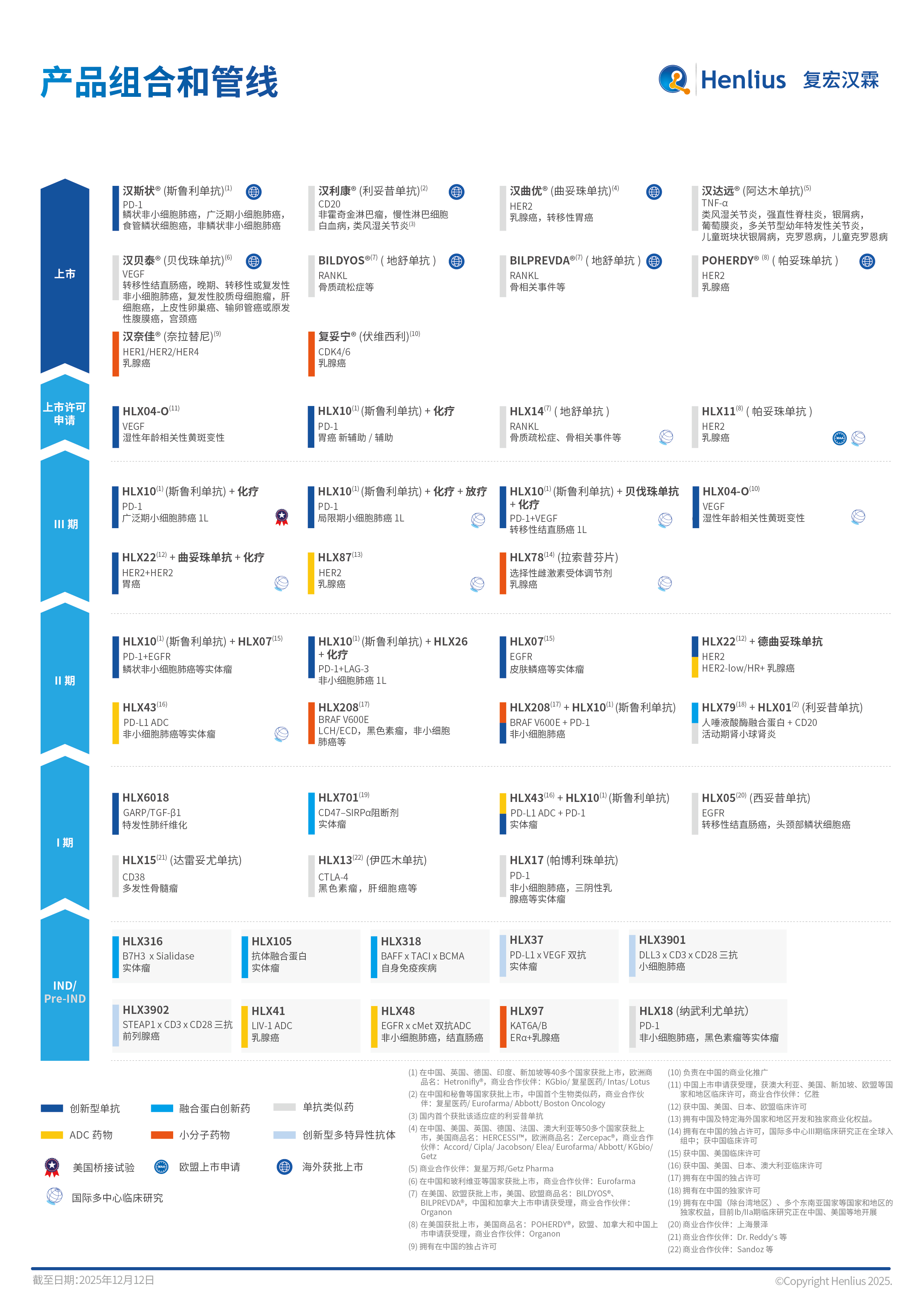 复宏汉霖已在全球获批上市10款产品,5个上市申请分别获中国药监局和欧盟EMA受理,19个产品在全球范围内开展30多项临床试验,对外授权全面覆盖欧美主流生物药市场和众多新兴市场。公司已获批上市产品包括全球首个获批一线治疗小细胞肺癌的抗PD-1单抗汉斯状®(斯鲁利单抗,欧洲商品名:Hetronifly®)、自主研发的中美欧三地获批单抗生物类似药汉曲优®(曲妥珠单抗,美国商品名:HERCESSI™,欧洲商品名:Zercepac®)、国内首个生物类似药汉利康®(利妥昔单抗)、地舒单抗生物类似药Bildyos®和Bilprevda®,以及帕妥珠单抗Poherdy®。