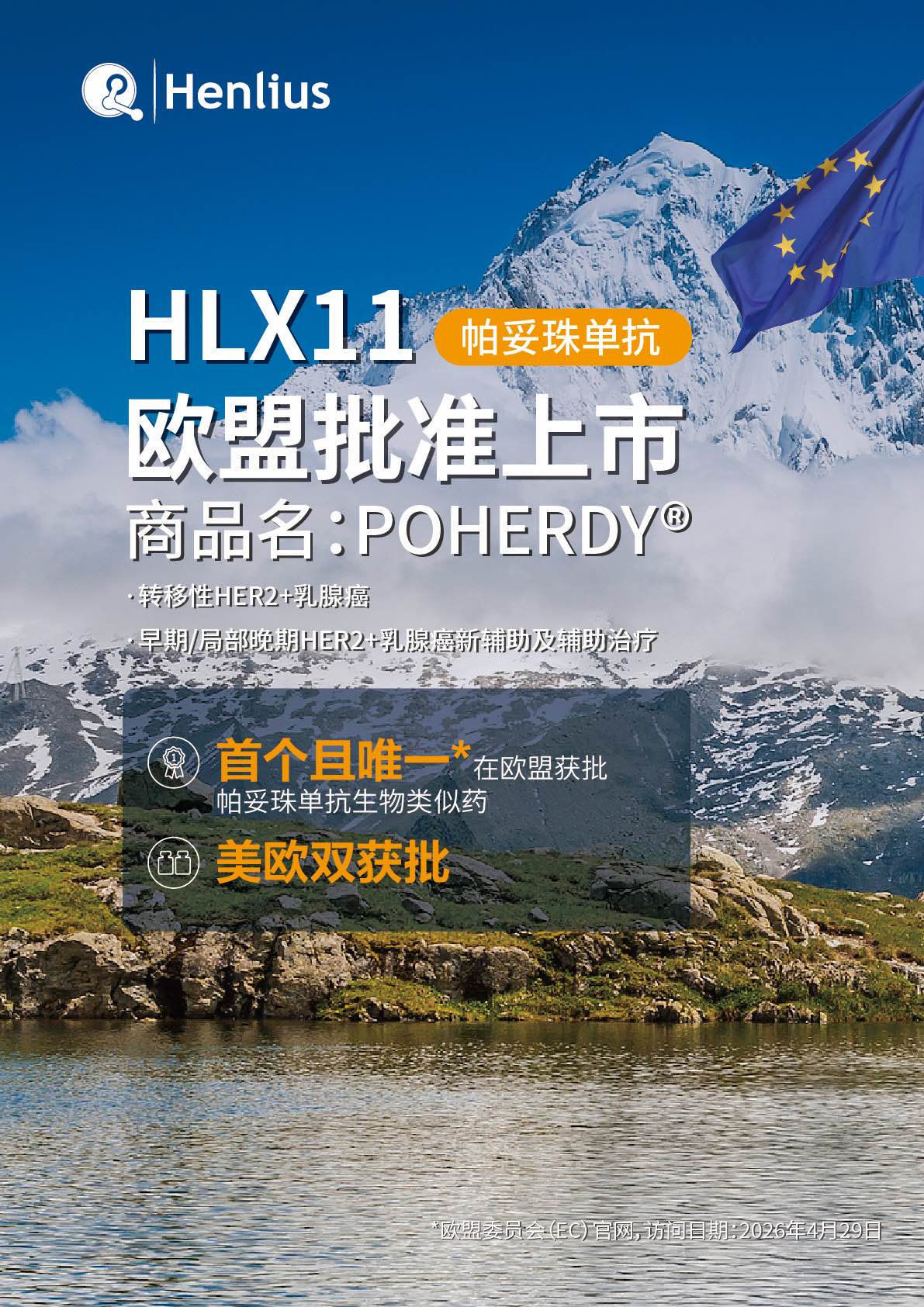 中國上海 & 美國新澤西州澤西市,2026年4月29日 —— 復宏漢霖(2696.HK)與Organon(紐交所代碼:OGN)今日聯合宣佈,歐盟委員會(European Commission, EC)已批准POHERDY®(帕妥珠單抗)420 mg/14 mL靜脈注射液的上市許可。該產品是歐洲首個且目前唯一獲批的PERJETA(帕妥珠單抗)生物類似藥,獲批適用於參比製劑的全部適應症1。