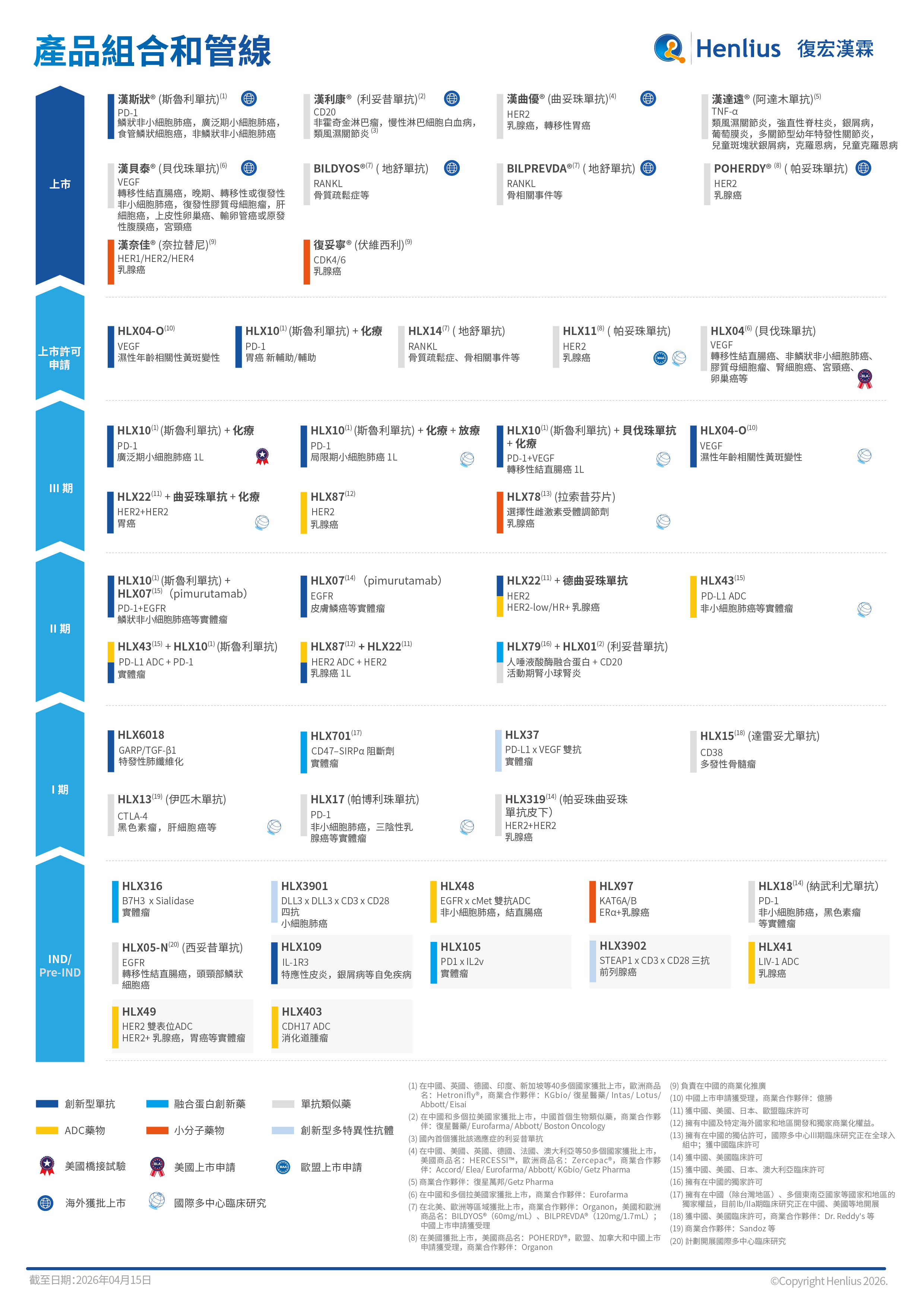 復宏漢霖已在全球獲批上市10款產品,6個上市申請分別獲中國藥監局、美國FDA和歐盟EMA受理,19個產品在全球範圍內開展30多項臨床試驗,對外授權全面覆蓋歐美主流生物藥市場和眾多新興市場。其中,公司已獲批上市產品包括全球首個獲批一線治療小細胞肺癌的抗PD-1單抗漢斯狀®(斯魯利單抗,歐洲商品名:Hetronifly®)、自主研發的中美歐三地獲批單抗生物類似藥漢曲優®(曲妥珠單抗,美國商品名:HERCESSI™,歐洲商品名:Zercepac®)、國內首個生物類似藥漢利康®(利妥昔單抗)、地舒單抗生物類似藥Bildyos®和Bilprevda®,以及帕妥珠單抗Poherdy®