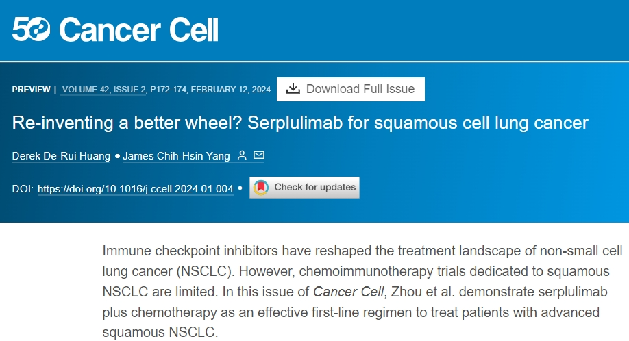 [2] Huang DDR, Yang JCH. Re-inventing a better wheel? Serplulimab for squamous cell lung cancer. Cancer Cell. 2024;42(2):172-174. doi:10.1016/j.ccell.2024.01.004.