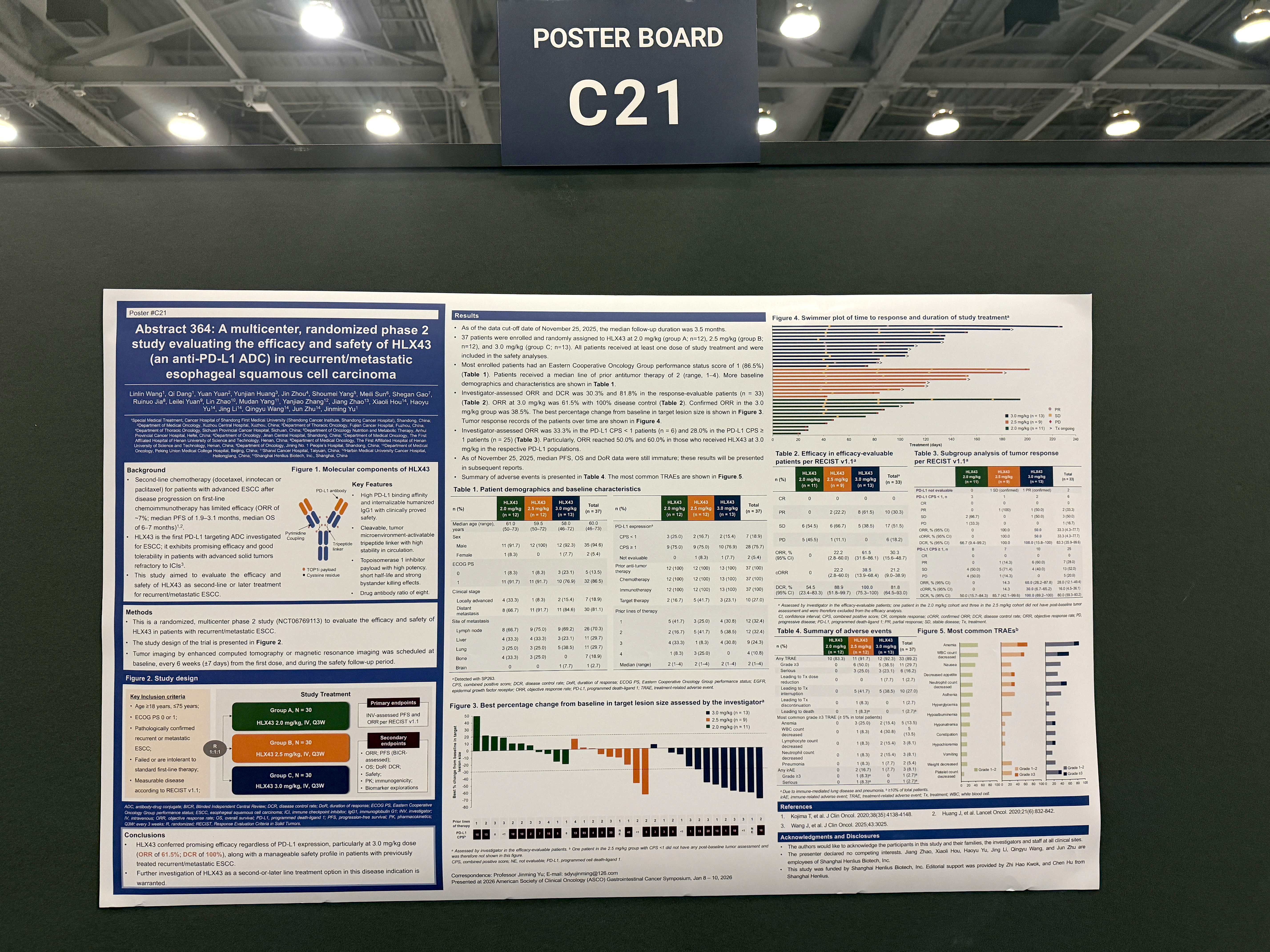 2026年1月9日,复宏汉霖(2696.HK)在2026年美国临床肿瘤学会胃肠道肿瘤研讨会(ASCO GI)上,首度公布了其PD-L1 ADC HLX43治疗复发/转移性食管鳞癌(ESCC)的II期概念验证(POC)数据,该研究由山东省肿瘤医院于金明院士牵头开展。本次发布的数据初步验证了HLX43在经治的晚期ESCC患者中的治疗潜力,展现出令人鼓舞的疗效及良好的安全性。HLX43已在非小细胞肺癌、宫颈癌、食管鳞癌及胸腺癌等多项实体瘤适应症中观察到持续且一致的疗效和安全性趋势,其广谱抗肿瘤潜力正通过临床实践逐步得到验证,为后续拓展更多适应症奠定重要基础。