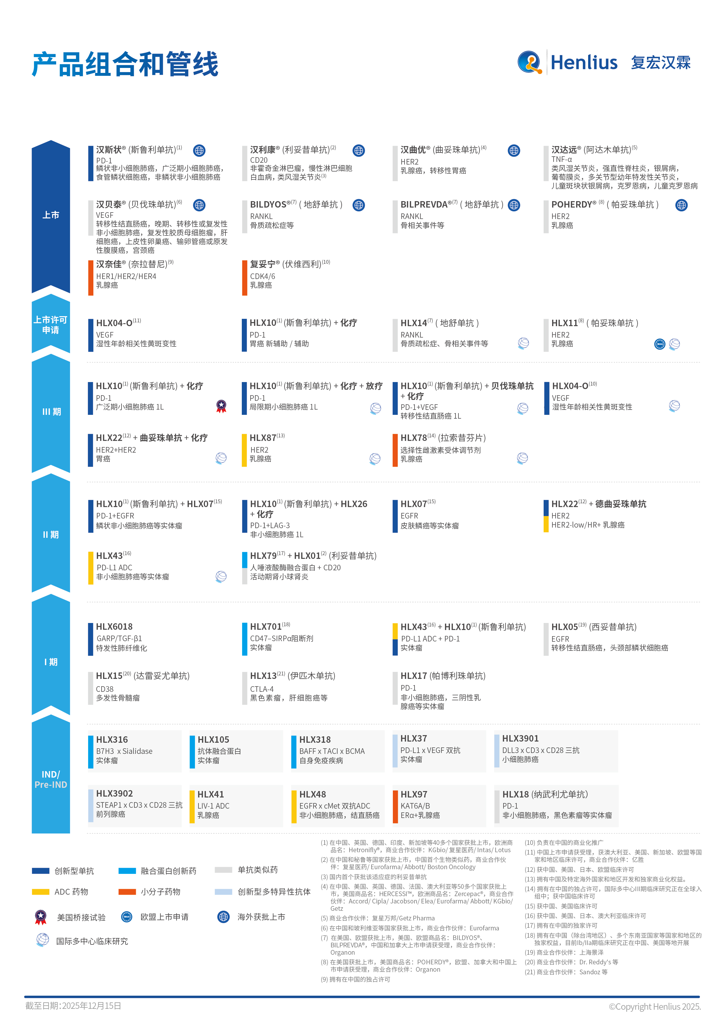 复宏汉霖已在全球获批上市10款产品,5个上市申请分别获中国药监局和欧盟EMA受理,19个产品在全球范围内开展30多项临床试验,对外授权全面覆盖欧美主流生物药市场和众多新兴市场。公司已获批上市产品包括全球首个获批一线治疗小细胞肺癌的抗PD-1单抗汉斯状®(斯鲁利单抗,欧洲商品名:Hetronifly®)、自主研发的中美欧三地获批单抗生物类似药汉曲优®(曲妥珠单抗,美国商品名:HERCESSI™,欧洲商品名:Zercepac®)、国内首个生物类似药汉利康®(利妥昔单抗)、地舒单抗生物类似药Bildyos®和Bilprevda®,以及帕妥珠单抗Poherdy®