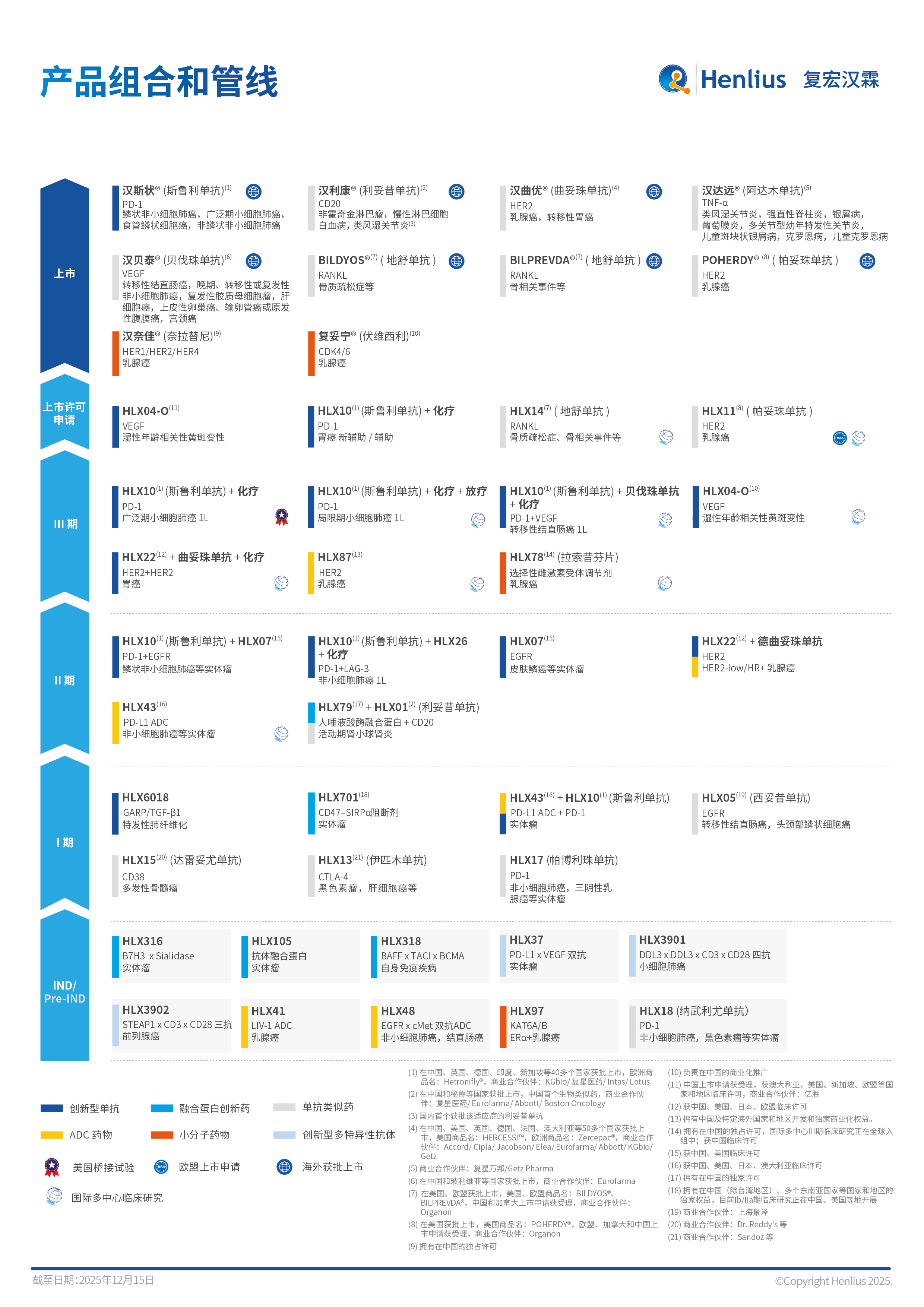 复宏汉霖已在全球获批上市10款产品,5个上市申请分别获中国药监局和欧盟EMA受理,19个产品在全球范围内开展30多项临床试验,对外授权全面覆盖欧美主流生物药市场和众多新兴市场。公司已获批上市产品包括全球首个获批一线治疗小细胞肺癌的抗PD-1单抗汉斯状®(斯鲁利单抗,欧洲商品名:Hetronifly®)、自主研发的中美欧三地获批单抗生物类似药汉曲优®(曲妥珠单抗,美国商品名:HERCESSI™,欧洲商品名:Zercepac®)、国内首个生物类似药汉利康®(利妥昔单抗)、地舒单抗生物类似药Bildyos®和Bilprevda®,以及帕妥珠单抗Poherdy®。